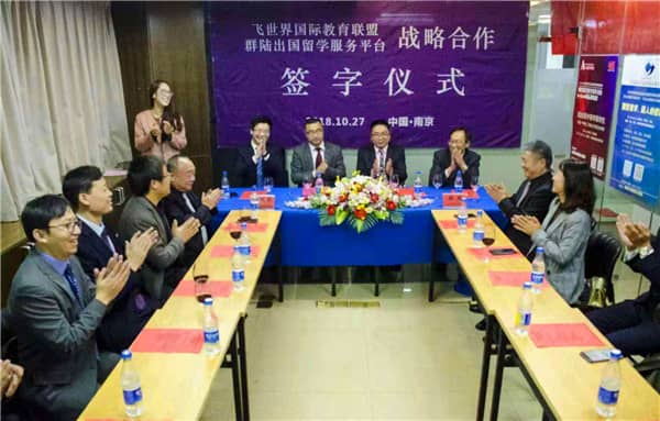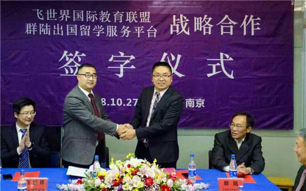 中国江苏网讯 10月27日,飞世界国际教育联盟与群陆出国留学服务平台战略合作签约仪式在南京举行。