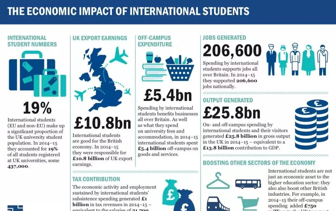 那么很多小伙伴会有疑惑,英国脱欧是否会殃及我们中国留学生呢?小编觉得脱欧后对中国留学生未必不是一件好事,因为英国作为一个教育大大国,从世界各地(当然,中国学生是主力)来到英国的留学生,为英国大学贡献了学费,为当地经济贡献了大量的消费。留学生给英国带来了超过20万个就业岗位。他们的学费,旅行和生活成本经济效益价值258亿英镑,其中包括10亿英镑的税收收入。