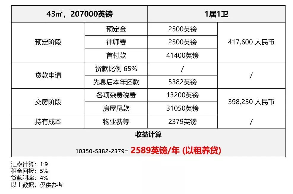 交房之后,按5%的租金回报率计算,扣除月供、物业费、地租费、中介费,每年的收益差不多是2589英镑