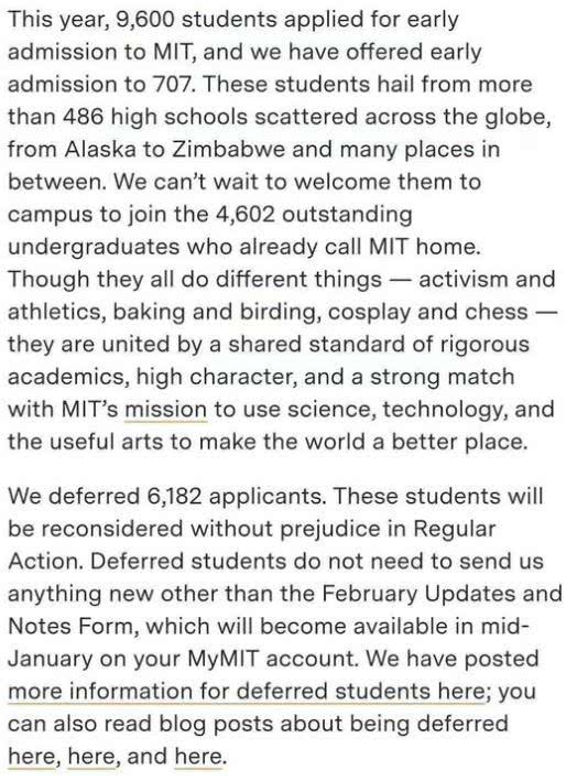 麻省理工学院在今年EA(Early Action)录取中,707位新生没有一人来自中国大陆高中,可以说是全军覆没。虽说有5个中国学生,但都来自于美高。