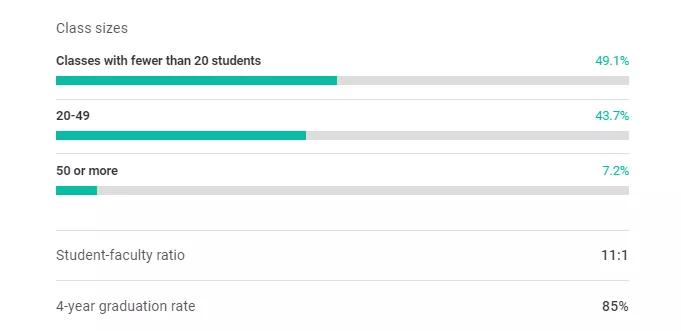 大多数私立学校推崇小班教学模式,班级规模平均10-15名学生。比如,哥伦比亚大学小班教学比例(平均20人以下班级)为82.9%,西北大学的小班教学比例为82.9%,芝加哥大学的小班教学比例为77%,而耶鲁为75.2%。