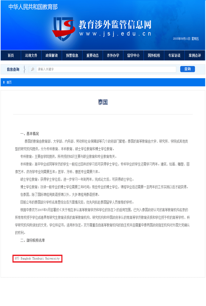 (1)所有国外的大学文凭,中国教育部承不承认,要看这所学校有没有在“中国教育部涉外监管信息网”上是否有备案和公示,有就代表有招生资格,文凭得到承认,并在留学回国后能得到中国教育部的认证,并能得到中国教育部办理的毕业派遣。曼谷吞武里大学在中国教育部涉外监管信息网泰国高校中,编号87号。