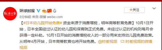 10月1日开始,日本全国经过认证的幼儿园和保育院正式免费。未经过认证的机构则每月会获得一定补助。10月1日开始的消费增税收入的一部分用来支持幼儿园免费政策。从明年4月开始,日本高等教育也将开始免费。