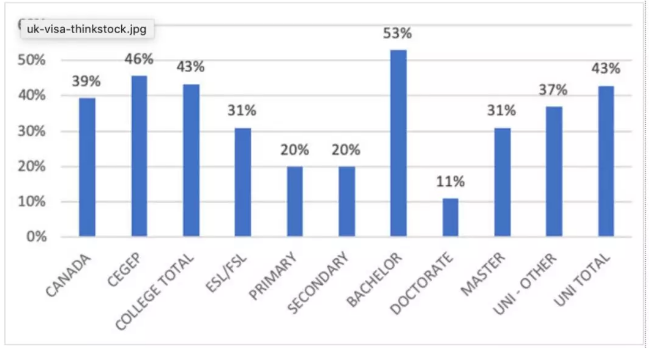 然而这一情况在2018年有所改变,这一年攻读学士学位课程学生的拒签率超过了就读学院的申请人。正如我们在下面的图表中所看到的那样,在2019年的前五个月中有超过一半就读本科的学生的申请被拒绝。而相比之下,就读硕士课程的拒签率为31%,就读学院的学生的拒签率为43%。