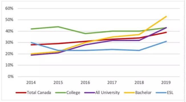 从2014年到2018年,在加拿大就读的外国留学生总数增长超过73%,使该国成为这五年间全球增长最快的留学目的地。