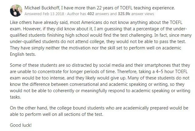 大多数美国人对于托福一无所知(人家又不用考),所以不能轻易回答这类超纲题。但还是有一部分本土老美曾接受过托福洗礼。真正的勇士敢于面对托福考场三小时,经历托福考试之后表示如果真的要考托福,“相信很多高中时成绩不够优秀的学生,一定会觉得这考试很难”。“事实上,很多学生因为成绩问题没能考上大学,表明自身并没有充足的动机和能力水平,在托福这种学术性英语考试中很难表现出色。”