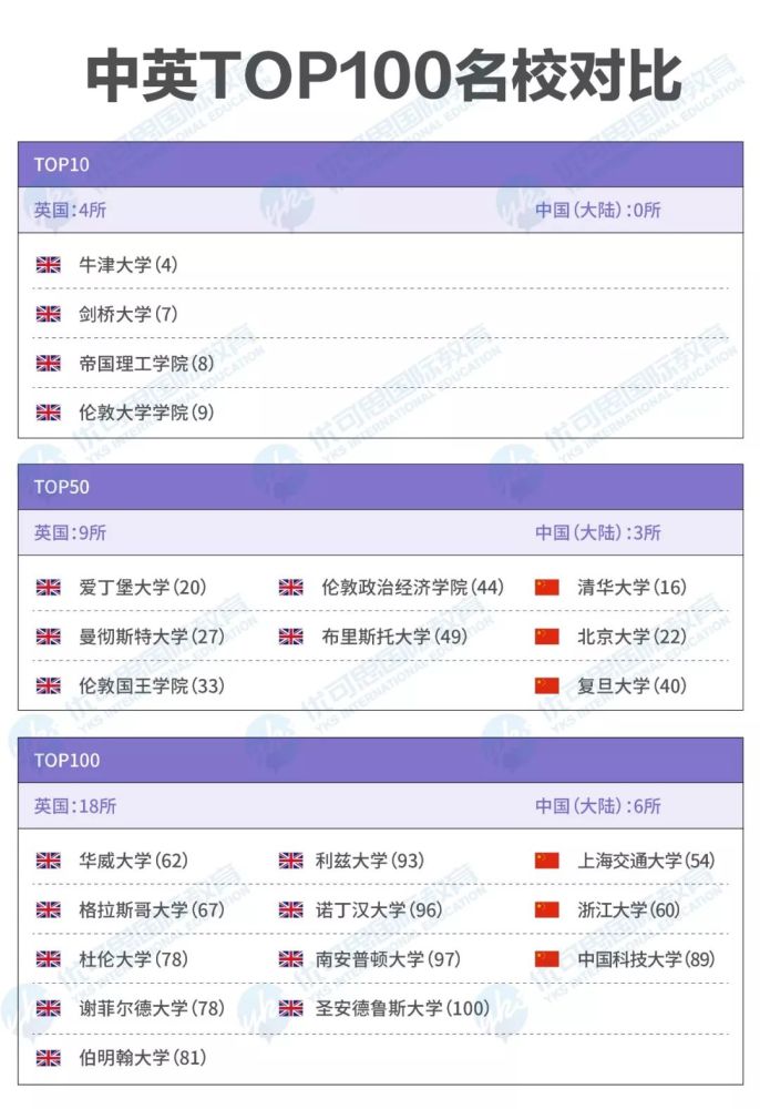 英国硕士以学制短、含金量高、教育水平高而闻名世界,在QS世界前100院校中,英国就有18所院校入围,而中国大陆院校仅占6席。相比清北复交的激烈竞争,英国名校的录取方式更加灵活,院校排名更加靠前且选择更多。