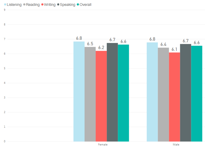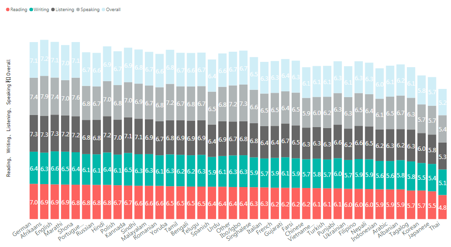 以汉语为母语的考生当中,总分平均分为6.1,口语平均5.9,听力平均6.3,写作平均5.7,阅读平均6.2分。