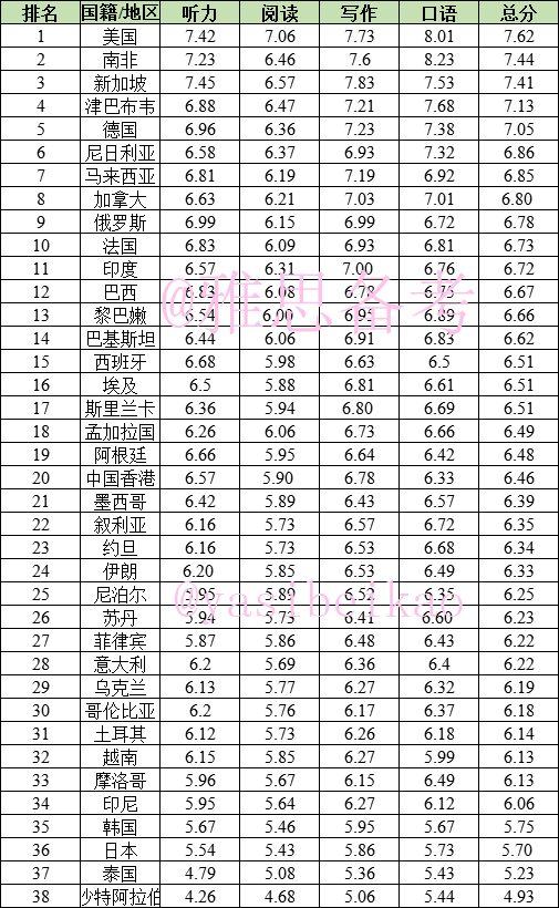 需要特别注意的是,虽然印度、泰国、日本口音的英国备受大家吐槽,但是这三国的雅思口语均分都高于我国大陆考生啊!印度口语均分5.99,泰国口语均分5.91,日本口语均分5.56,而中国大陆口语均分5.39...... 所以,口音真的不会影响你的得分。
