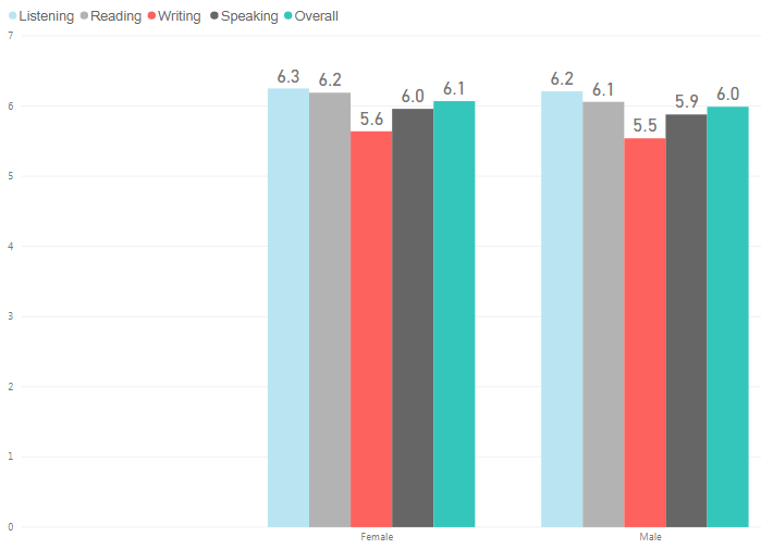 男考生平均分,总分6.0,听力6.2,阅读6.1,写作5.5,口语5.9。