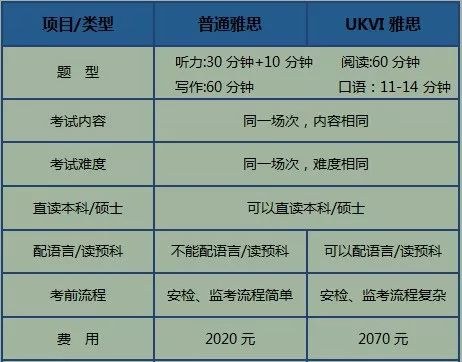 从考试内容看,普通雅思和UKVI雅思没有任何区别,但考场安排不同,UKVI雅思监考更严格。从用途来说,普通雅思达到英国大学本科/硕士直接录取要求时,可以用来直读,但成绩没达到的情况下,不能用于配语言。要想配语言或读预科课程,必须考UKVI雅思。