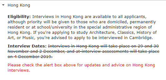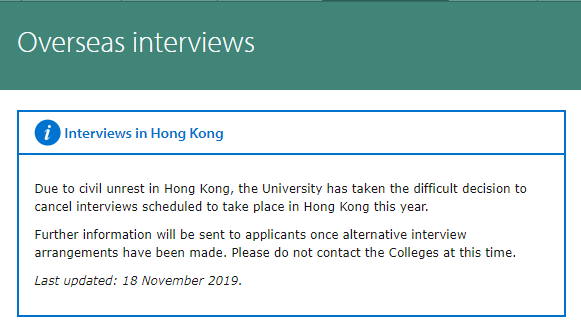 剑桥大学表示,因为香港动乱的现状,不得不取消本来计划好的香港面试,被安排在香港面试的申请者不需要直接联系校方,他们将会收到新的安排通知。