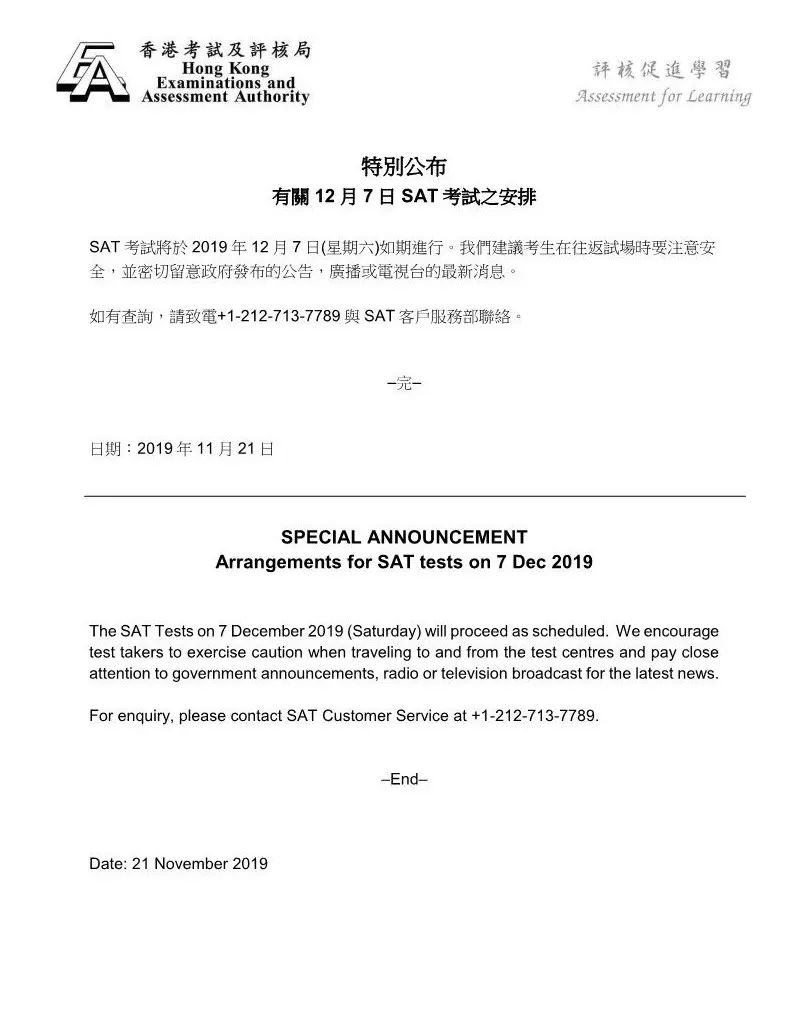 上周,香港考试及评核局在全港停课前一天发布通知宣布评核中心停止服务,很多同学都担心会影响12月的考试。在大家的迫切关注之下,香港考试及评核局官网发布了特别通知,宣布12月7日的香港场SAT考试将如期进行!