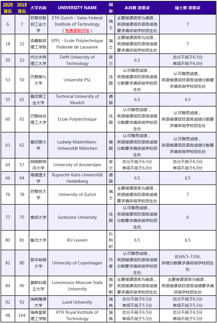 2020年QS世界大学欧洲榜中,共有391所大学入榜,其中英国、德国、意大利、法国、西班牙是入榜数最多的五个国家。获得欧洲榜单第一的是英国的牛津大学,瑞士的苏黎世联邦理工学院击败剑桥大学,成为欧榜的NO.2。