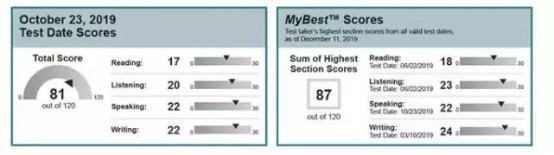 在两年内参加过多次托福考试的学生,ETS将会列出学生每次考试的单项最高分,并且给出各单项最高分之和的总分作为拼分成绩。ETS官方将本项计划称之为MyBest Scores(我的最佳成绩),计划从2019年8月1日起正式启动。届时,考生在选择托福送分时,除了正常递送的某次考试的成绩外,还会同时显示考生在过去两年内所有考试的拼分成绩。