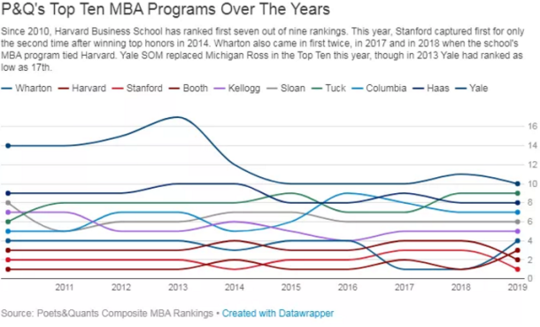 自从2014年斯坦福商学院获得第一后,15、16年跌到第二,17、18更是到达第三名。今年斯坦福商学院重返第一,斯坦福GSB商学院能够重返第一,得归功于其在Financial Times、Businessweek两大排名中获得第一,另外在U.S.News和福布斯排名中都是第二,整个2019年的排名都可见斯坦福商学院的强势所在。
