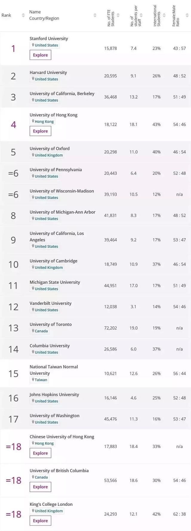 牛津、斯坦福、苏黎世联邦理工学院占据前三,麻省理工第4,剑桥第5。清华排名中国第1,世界第15,香港科技排名第17。