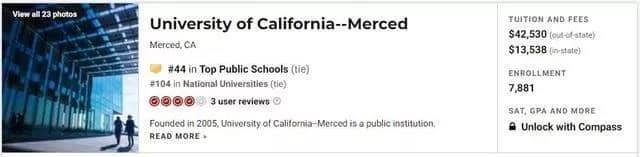 录取条件:TOEFL要求80分以上,雅思要求7.0以上,SAT均分950-1150,TOEFL与IELTS均无单项成绩要求,不提供条件录取。SAT阅读560以上,或ACT英语24分以上,可以豁免TOEFL/IELTS成绩。加州大学默塞德分校未设定有最低GPA分数要求,亦未设定有班级排名要求。但同时学校又指明,国际学生的GPA最好不低于3.4分。
