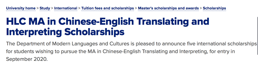 而2020年新开的中英翻译专业,也提供了丰厚的专业奖学金来吸引优秀申请人。2个10000磅,3个5000镑的名额和金额,对于一个人数不多的语言类专业来说,可谓是高配了。申请人需提交申请表、简历和成绩单等材料来进行申请,截止日期为4月30日。对中英翻译感兴趣的同学,可千万不要错过了。