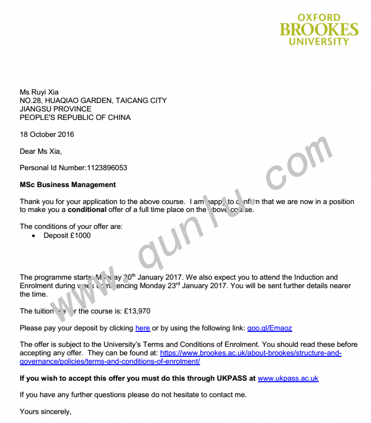 • 恭喜夏同学获得Oxford Brookes University的offer