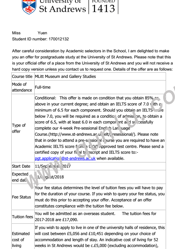 • 恭喜袁同学获得University of Edinburgh、University of Glasgow和University of St Andrews的offer