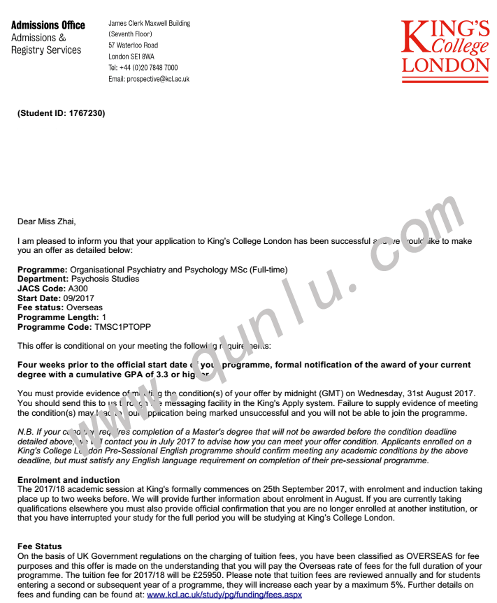 • 恭喜翟同学获得King's College London的offer