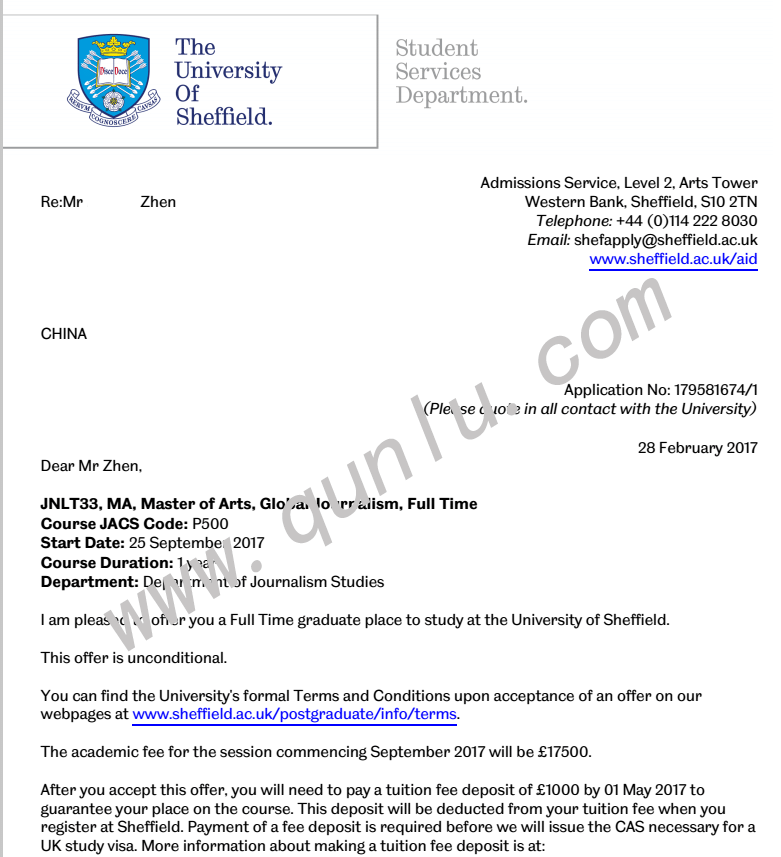 • 录取结果: University of Sheffield