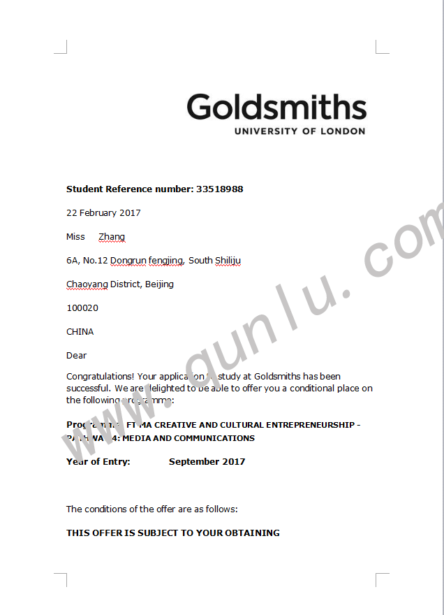• 恭喜张同学获得Goldsmiths, University of London和University of Westminster的offer