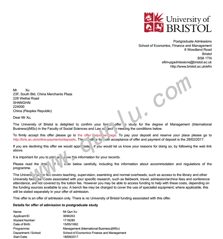• 录取结果: University of Bristol