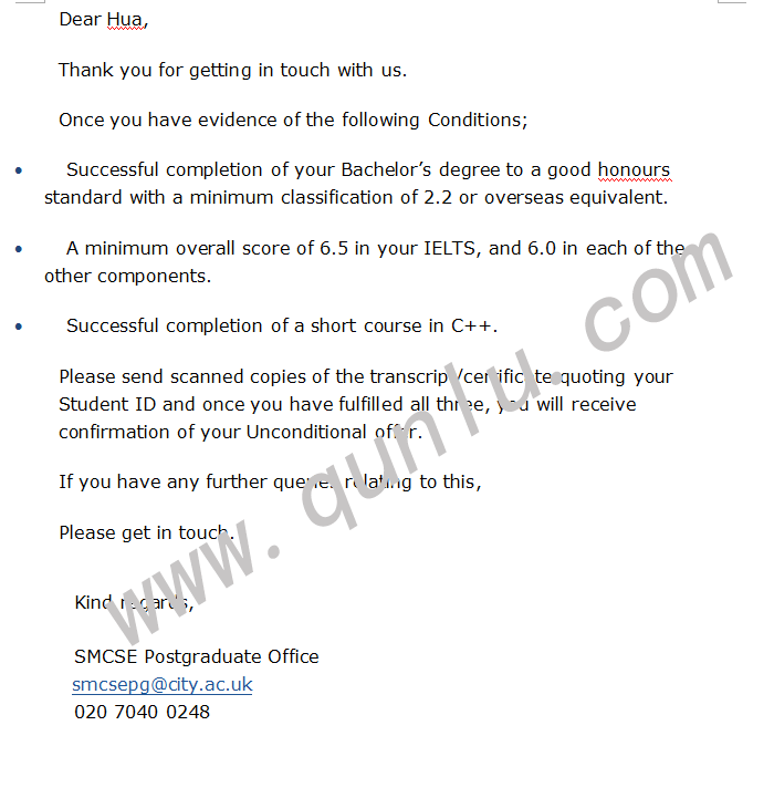 • 恭喜华同学获得City University London的offer