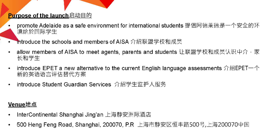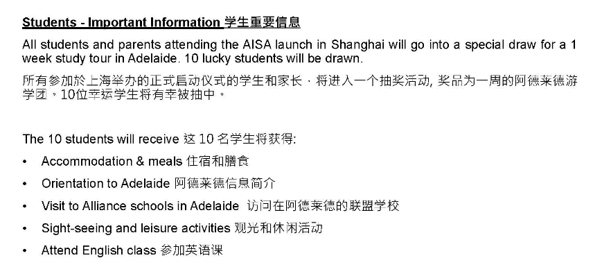 阿德莱德独立学校联盟(AISA)是与南大利亚首屈一指的非公立学校共同合作。联盟成员认识到,需要采取全面的国际学生招聘,以支持学生的福利不仅限于招生。本次阿德莱德独立学校联盟将举办正式仪式,相关活动信息如下: