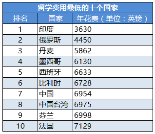 留学费用最低的当是印度,留学生在印度学习一年大约需要3629.62英镑,相当于3.5万元人民币,其次是俄罗斯,一年留学费用大约需要4449.9英镑,相当于人民币4.3万元左右,紧接着是墨西哥、西班牙和比利时。但是,这些留学国度并不热门,毕竟和供求关系有关。