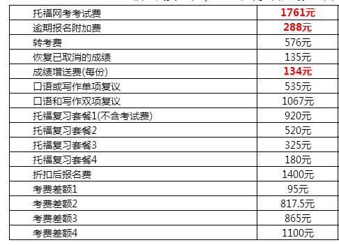 2016年5月1日,托福报名官网发出通告,中国大陆地区托福考试费涨至1761元,逾期报名附加费涨为288元。转考费和成绩单增送费也分别上涨。