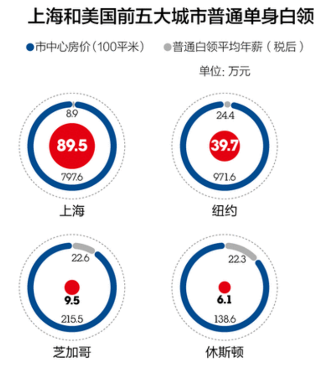 拿普通白领来说,工作在纽约的平均税后月薪是人民币20368元,但上海只有7423元,这还只是平均水平。