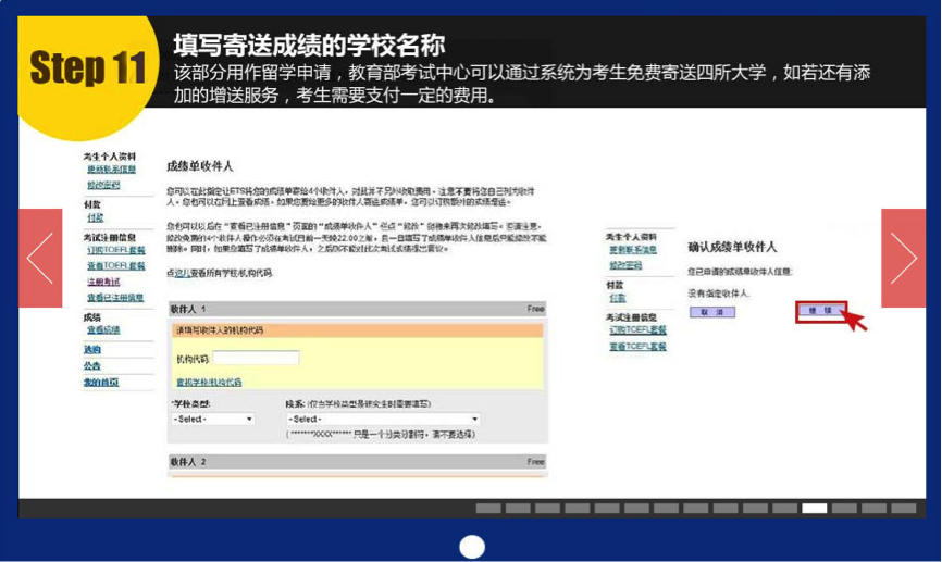 托福网考向考生指定的四所学校免费送出正式成绩报告。如需将成绩给这四所之外的学校,您可申请每份136元的成绩增送服务。通过“查看已注册信息”就可申请此项服务,申请前请确认您已支付成功或您的帐户余额充足。同时,请考生保证送分学校信息的正确性。