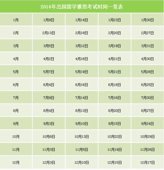 雅思考试(IELTS)由剑桥大学考试委员会外语考试部、英国文化协会及IDP教育集团共同管理,是一种针英语能力,也是现在出国留学的标配,下面是2016年出国留学雅思考试时间一览表准备出国的同学可以参考下。