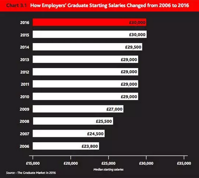 进入百强企业的英国应届生,平均起薪有多少?2016年平均起薪是30k,与去年持平。
