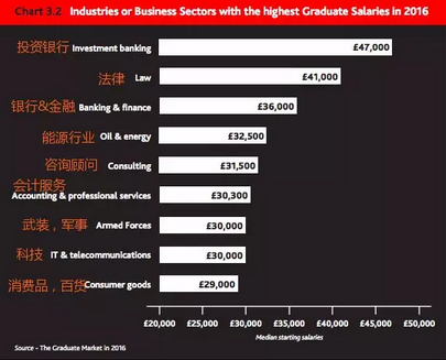 百强企业中,哪个行业的毕业生起薪最高?投行的banker们当仁不让,以47k英镑的年薪高居榜首,要知道,这可是起薪啊,以后还会涨!