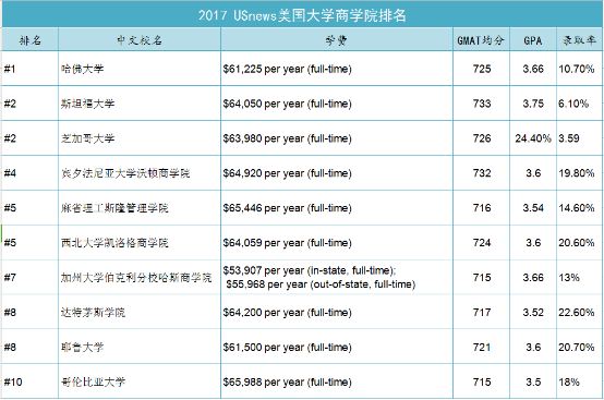 US news公布了最新的2017年美国大学商学院排名,哈佛大学、斯坦福大学、芝加哥大学排名前三,学费每年超6万美元,GMAT均分最高733,GPA最高3.75,芝加哥大学录取率仅3.59%!想留学美国的小伙伴,你还有信心申请这些牛逼商学院的offer吗?