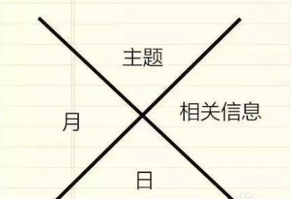 在笔记本上画一个×记号,将平面分成4个部分,按顺时针分别填写“主题”、“相关信息”、“日”、“月”,方便日后翻阅时快速索引、定位关键信息。