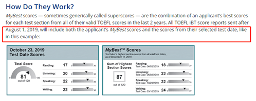 考生在申请时并不能只递送拼分成绩,ETS在向高校递送成绩时,同时包含了某次考试的正常成绩(学生可自主选择递送两年内的任何一次有效成绩),和考生在过去两年内所有有效成绩的拼分成绩。也就是说,高校拿到的成绩单,包含了两份成绩。
