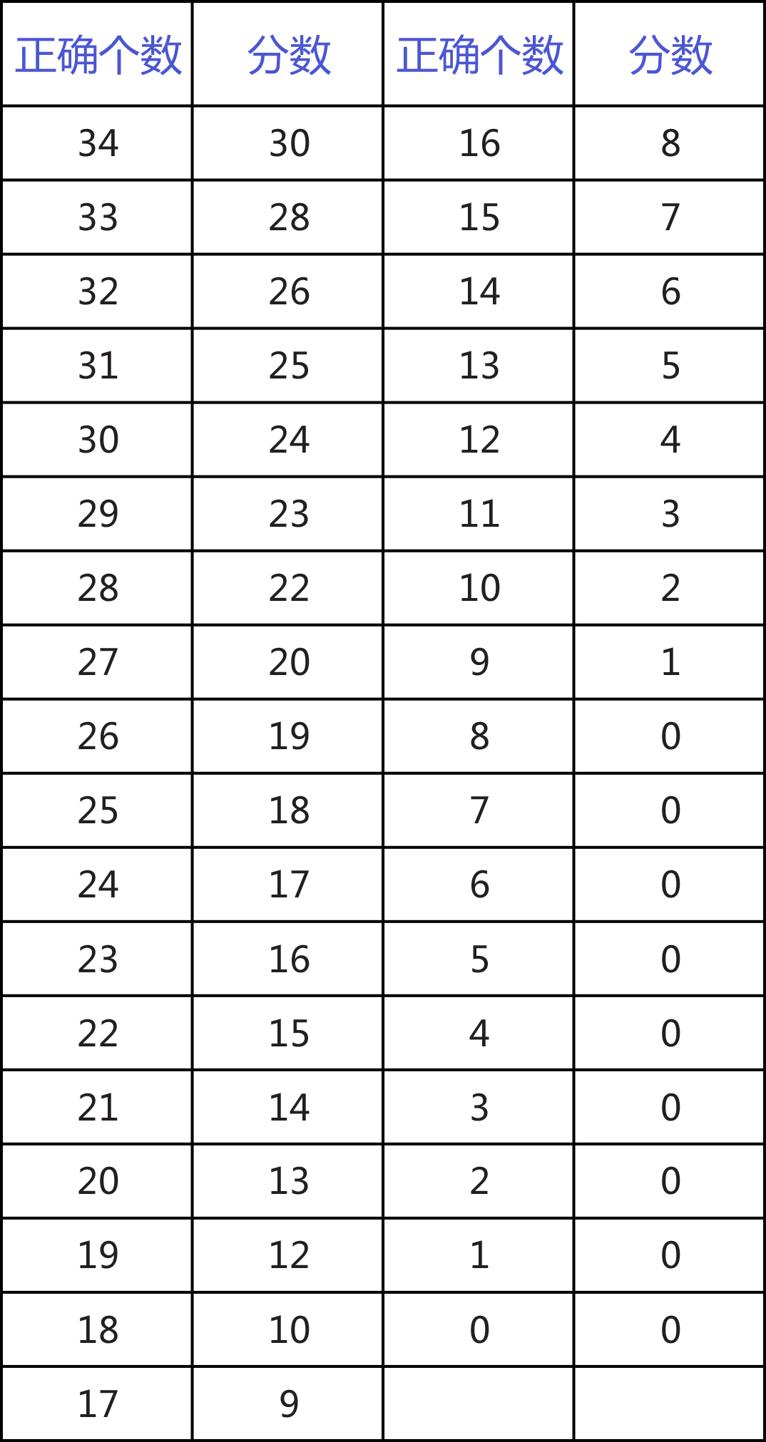 托福听力考试中,加试部分的 17 题是不计入算分计算的,所以只有 34 题算分,其规则如下: