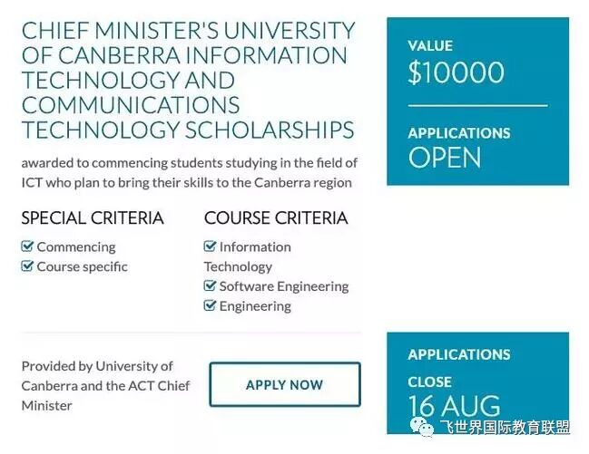 Chief Minister‘s University of Canberra Information Technology Scholarships就是堪培拉大学专门为学习信息通讯技术 (ICT) 专业的优秀学生设立的专项奖学金,价值$10000澳币。