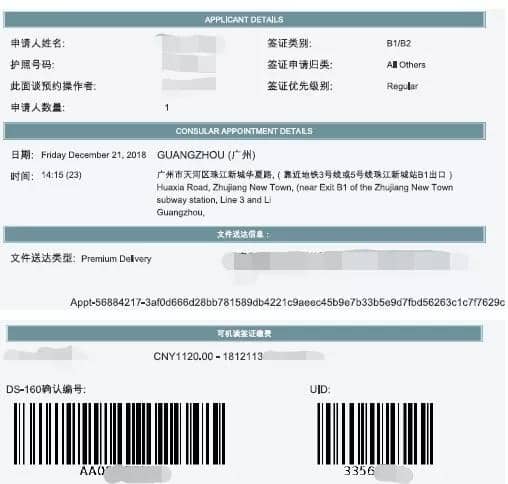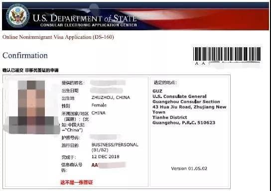 注:填写DS160表格后生成确认页并打印出来(https://ceac.state.gov/genniv/)。如果多位家庭成员前往,需要分开填写DS160表格,生成多份DS160确认页。下图为DS160确认页示例: