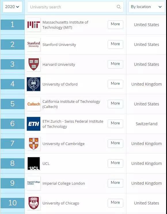 ▲2020年QS世界大学排名前10名。图源:网页截图