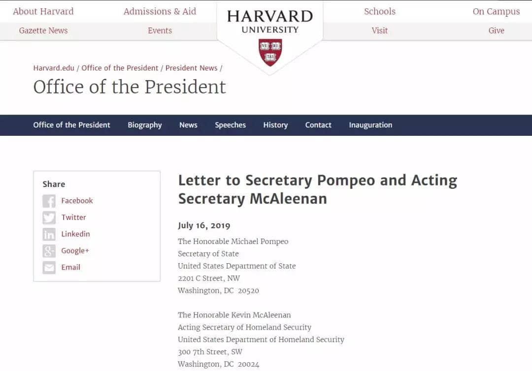 哈佛大学校长 Larry Bacow 也在 7月16日向美国国务卿 Michael Pompeo、国土安全部秘书 Kevin McAleenan 致函,呼吁他们加快外国学生和研究人员的签证和移民程序。