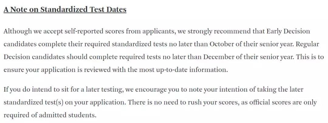 比如:杜克官网,11月1日之前必须完整递交申请并满足标化考试需求,但是也会考虑之后的考试。接受的最晚SAT考试日期是11月。