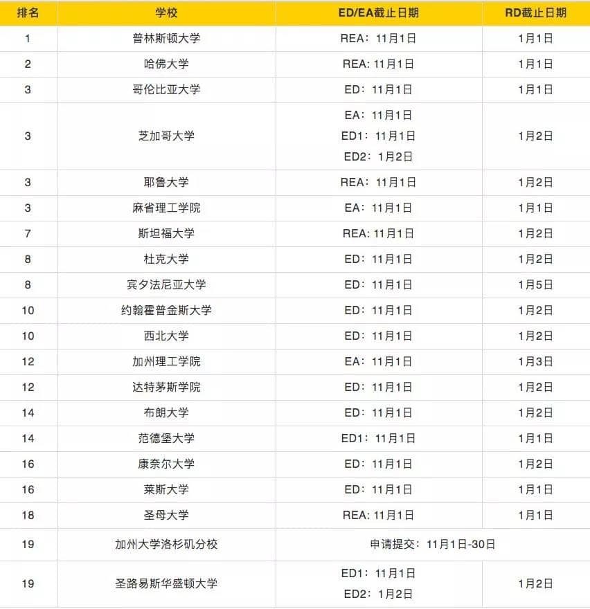 另外,这里还有一份2019-2020申请季美国大学EA/ED及常规申请截止日期。大家也可以看一下~