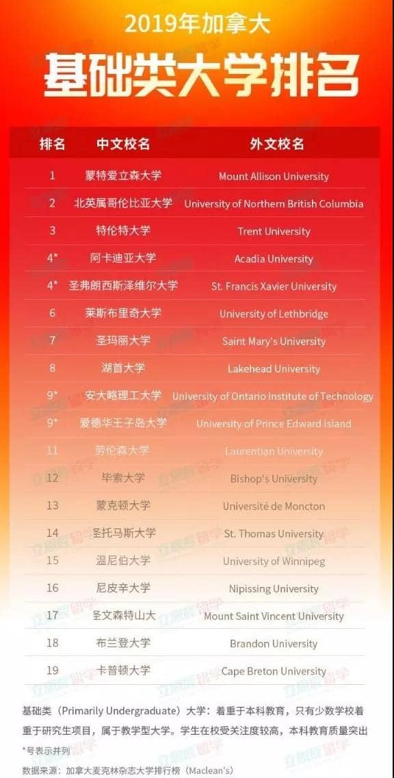加拿大麦考林杂志(Maclean‘s)发布的2019加拿大大学排名。本文和大家分享2019加拿大基础本科类大学排名。排名延续了往年的学生(28%)、教师(24%)、资源(20%)、学生支持(13%)、声誉(15%)五大领域的14项指标,数据来自加拿大统计局、社科人文研究委员会、加拿大自然科学与工程研究委员会、加拿大卫生研究院、Scopus等。