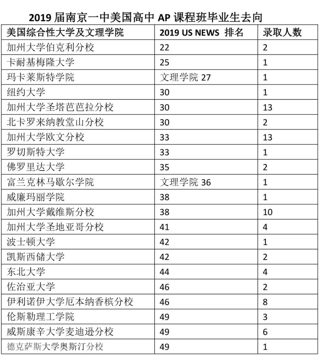 南京一中美国高中AP课程班2019届毕业生共有46人:2位学生被美国公立大学排名第一的加州大学伯克利分校录取,1位学生被卡耐基梅隆大学录取,1位学生被纽约大学录取,2位学生被北卡罗来纳大学教堂山分校录取,13位学生被加州大学圣塔芭芭拉分校录取。